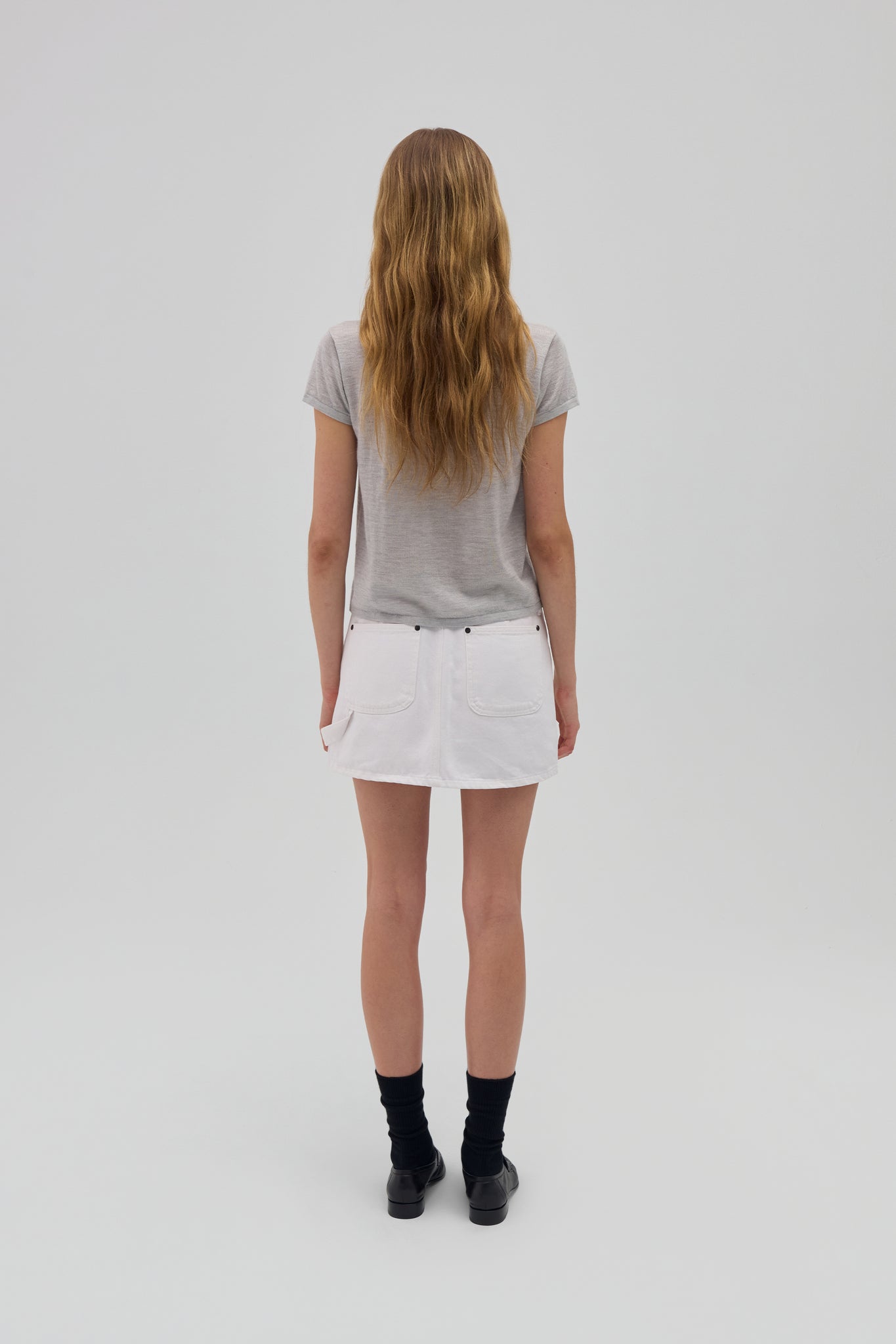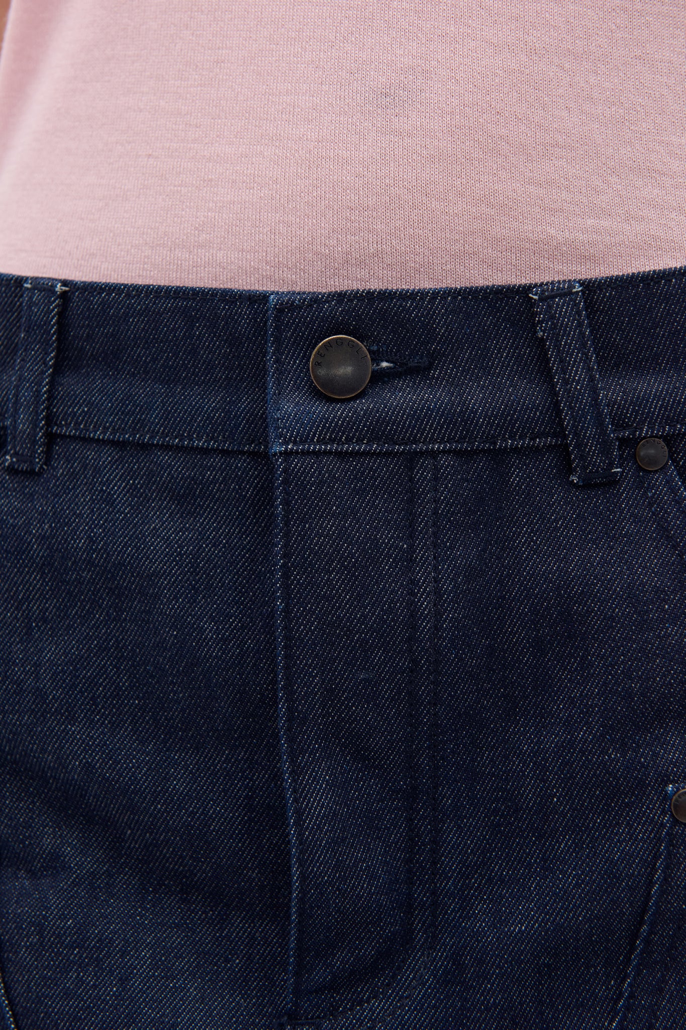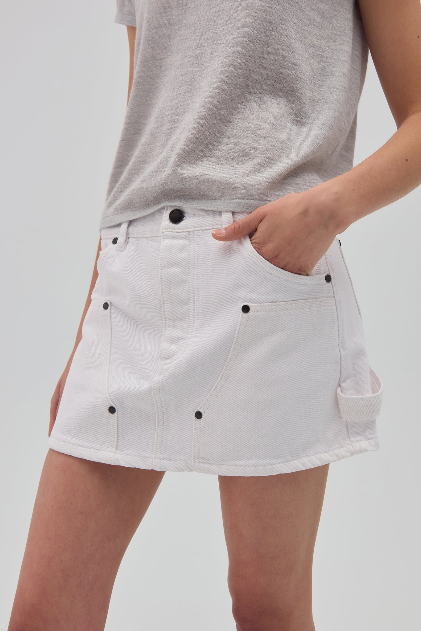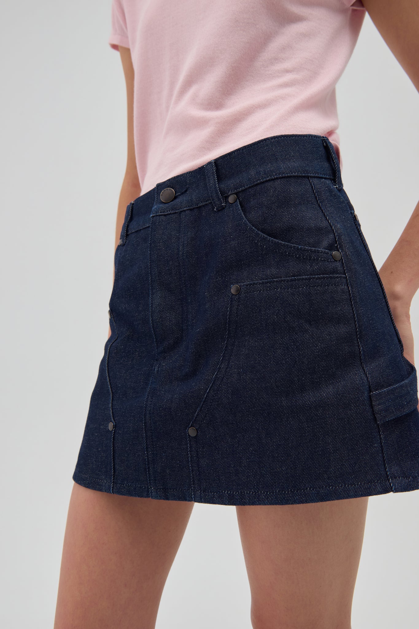 A mini skirt cut with a midrise fit and made of 12 oz denim. 5-pocket design, featuring traditional workwear details, such as front patches and a hammer loop. Also features branded metal rivets and shank.