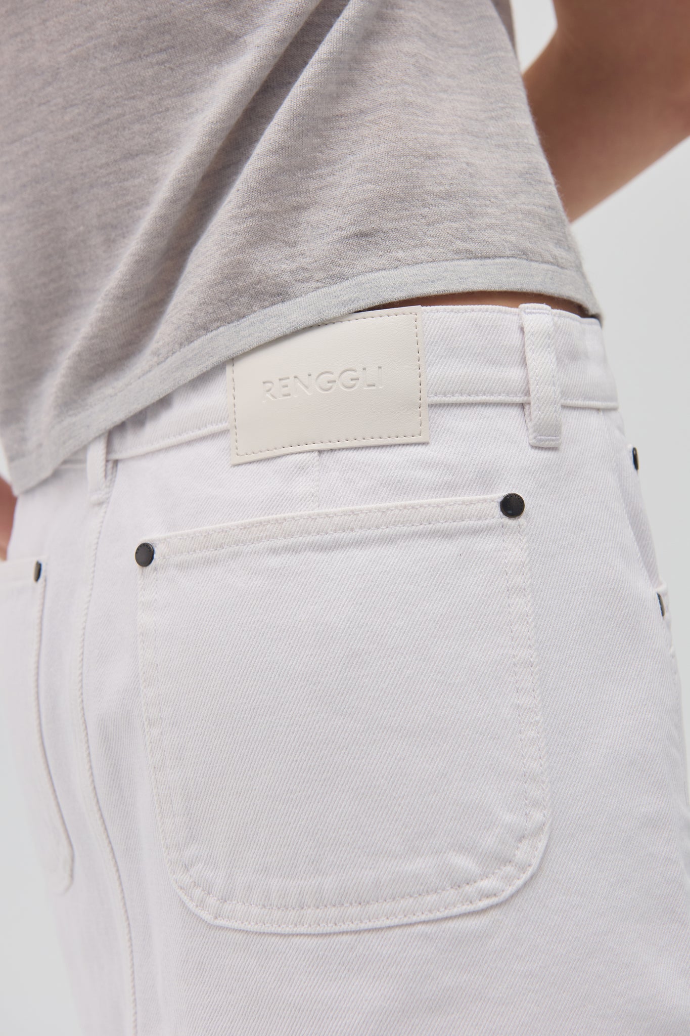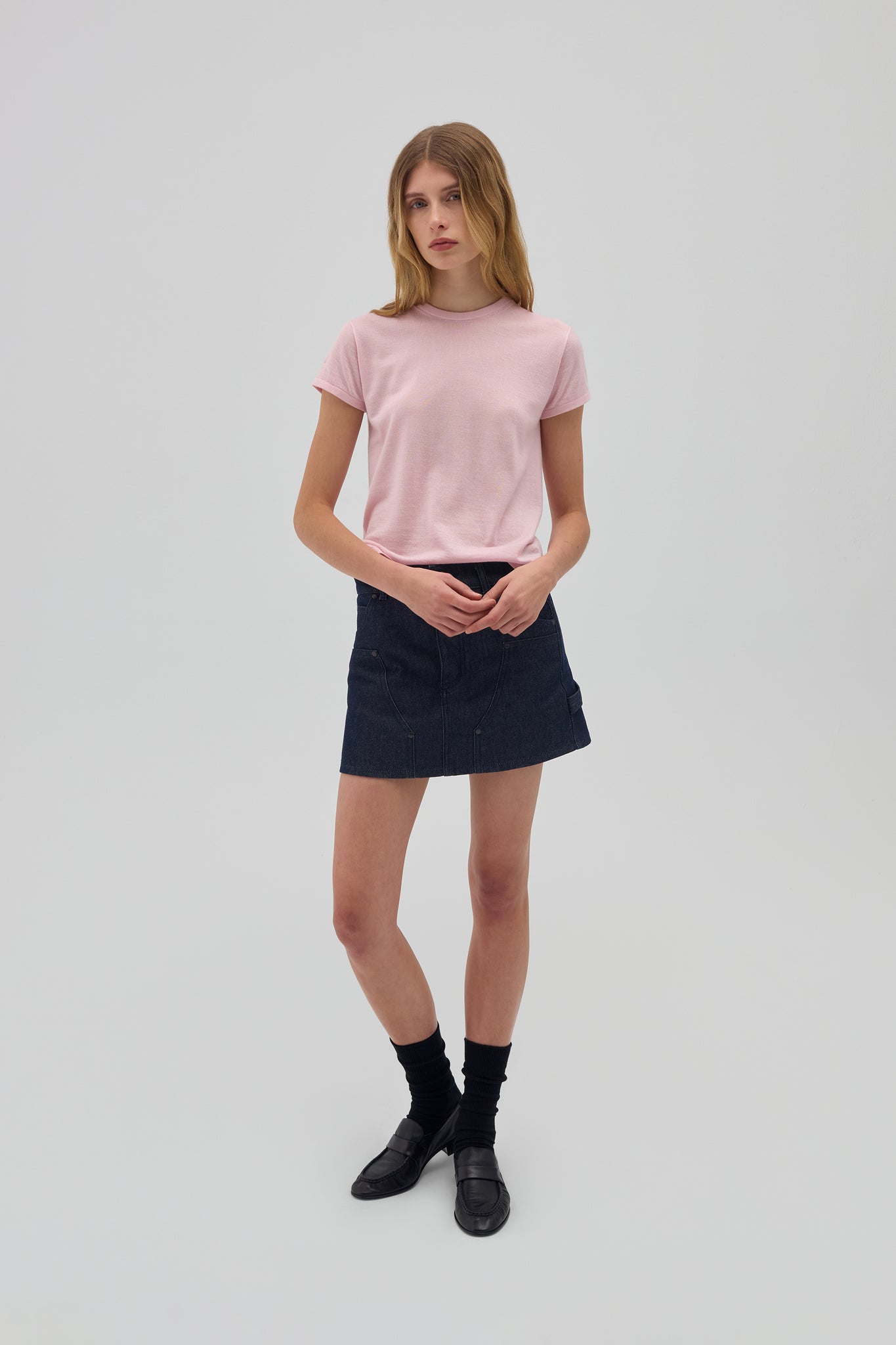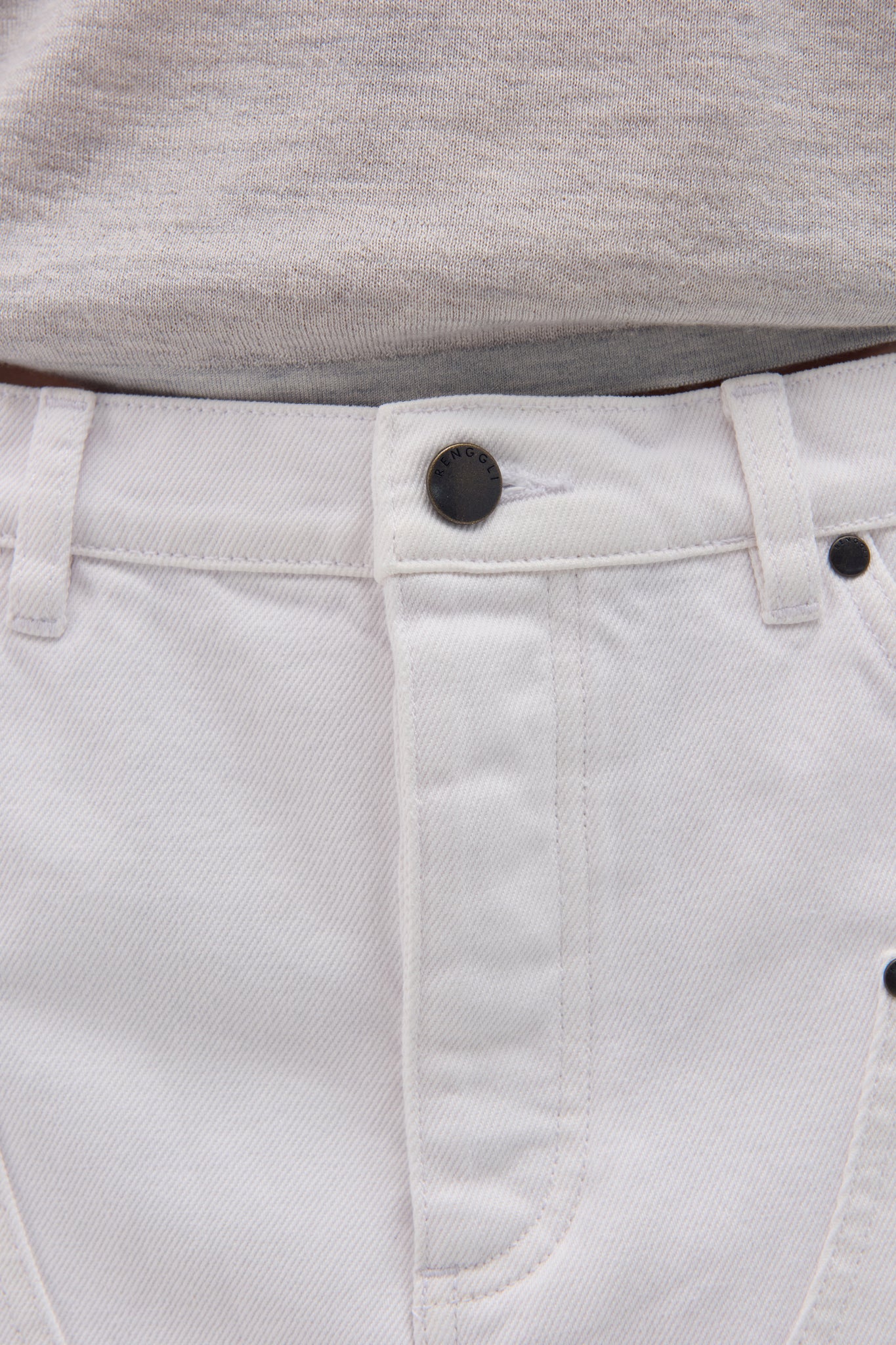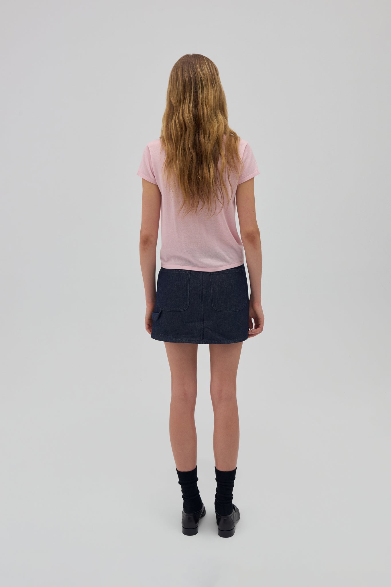 A mini skirt cut with a midrise fit and made of 12 oz denim. 5-pocket design, featuring traditional workwear details, such as front patches and a hammer loop. Also features branded metal rivets and shank.