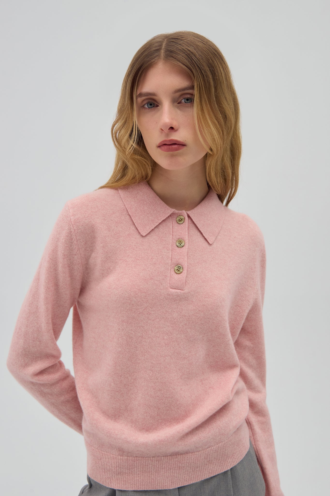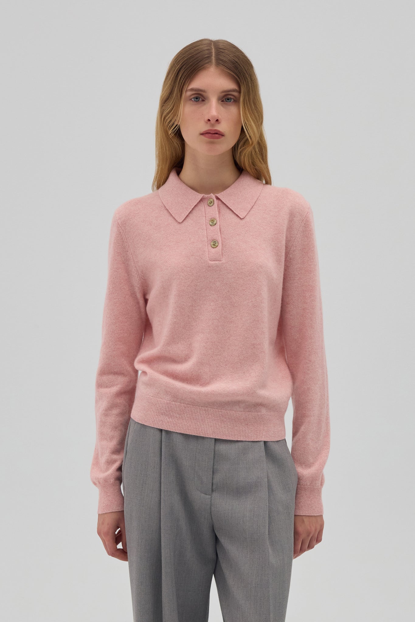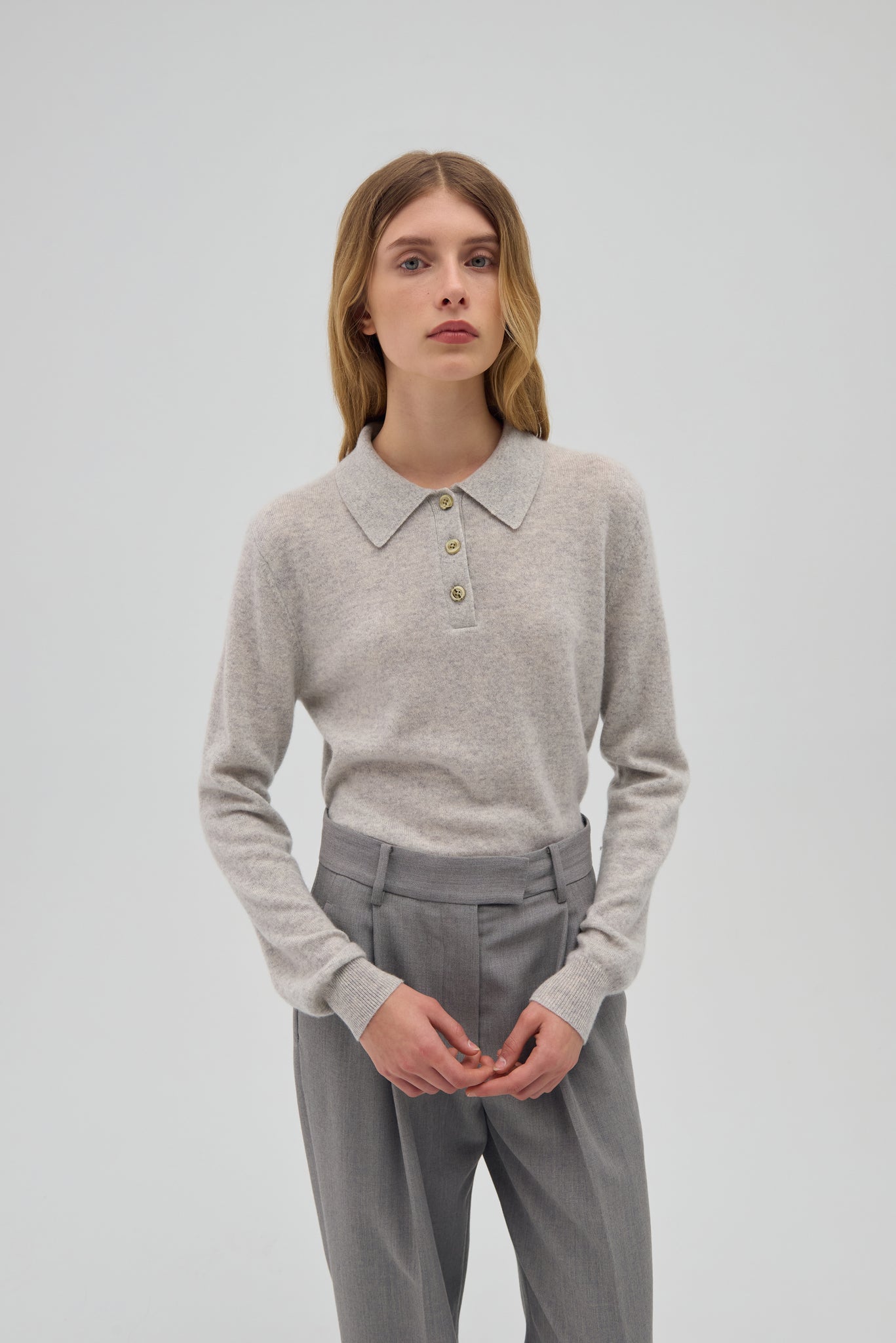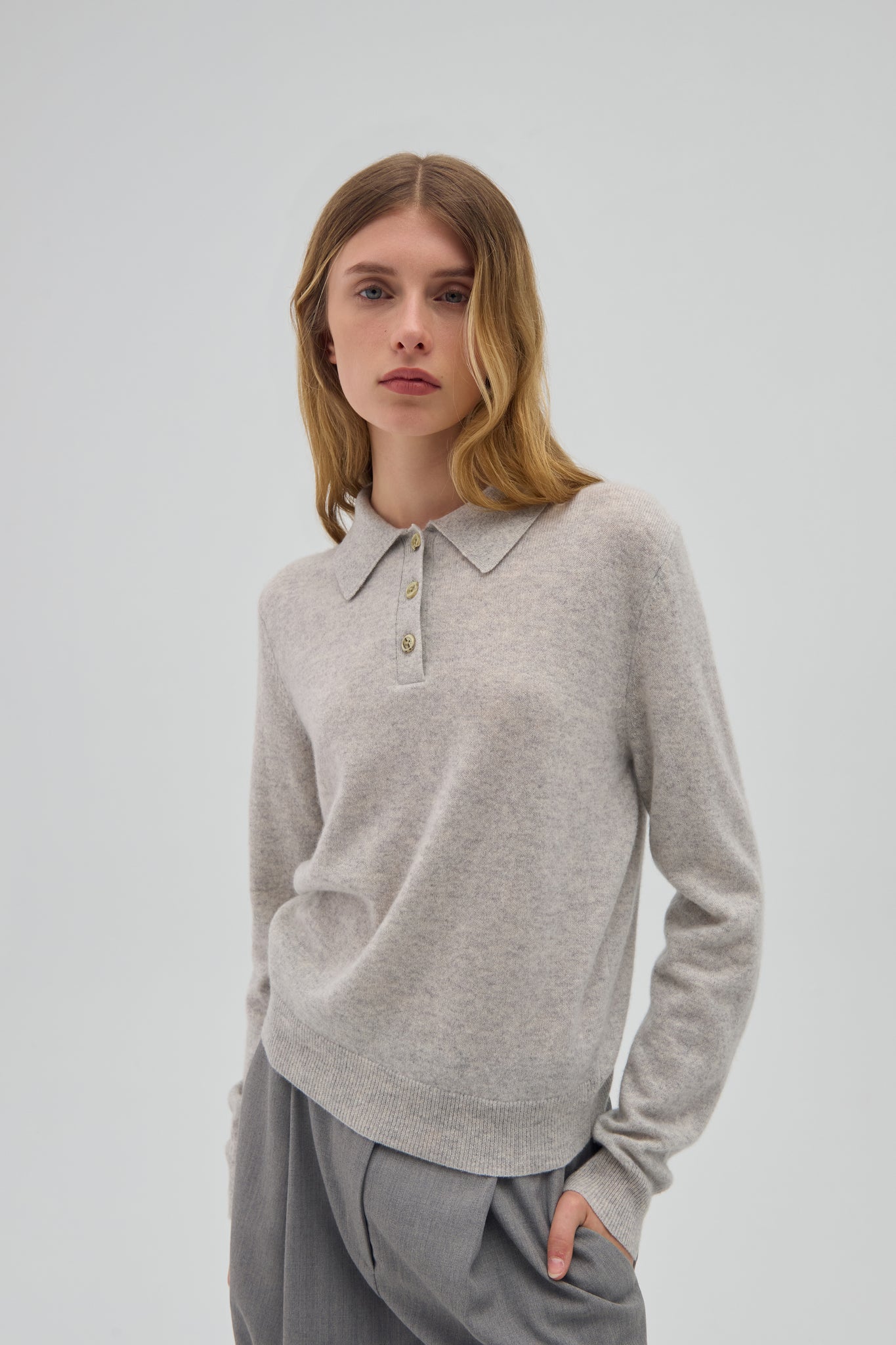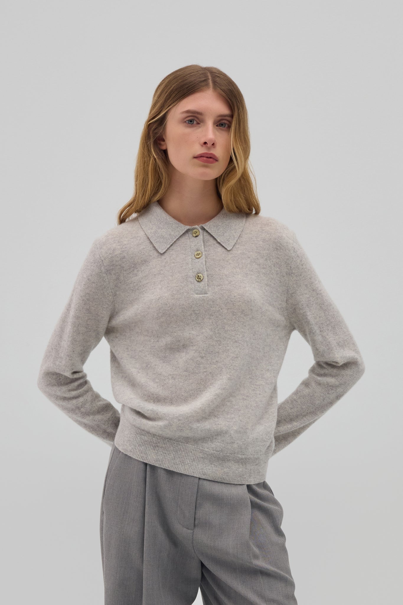 A midweight sweater made from 100% Cashmere for comfort and versatility. Features a classic collar and three-button placket, with rimmed buttons branded with an etched logo. Rib finishes at hem and cuffs.