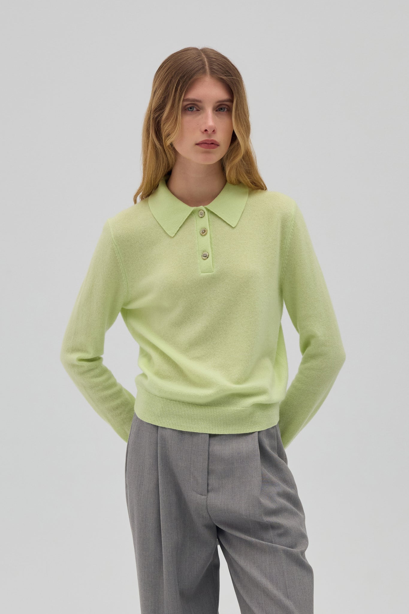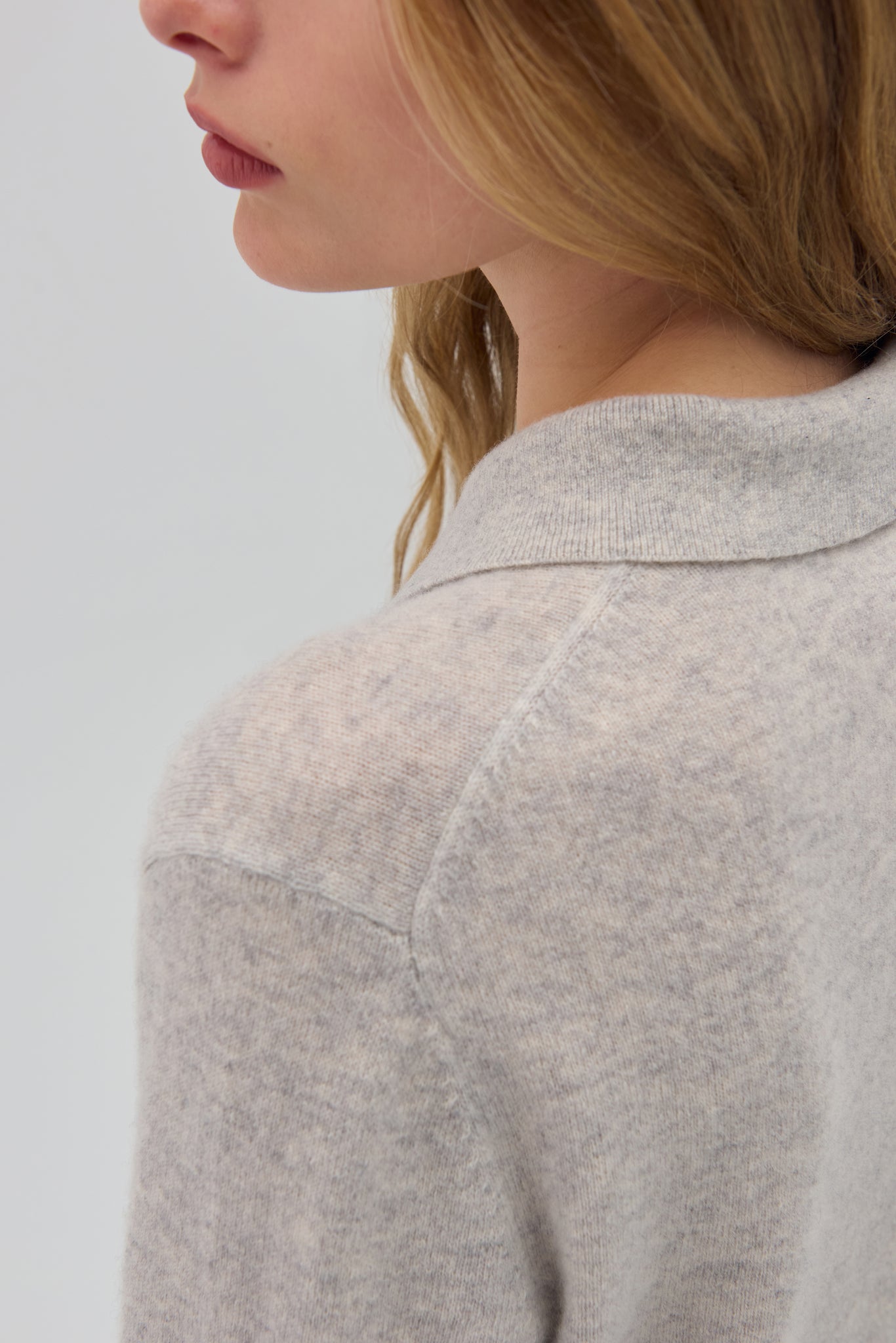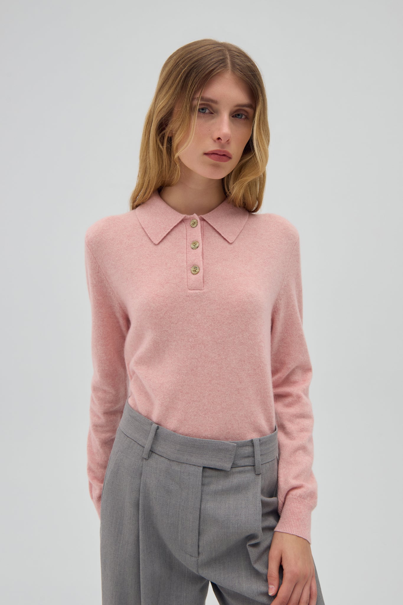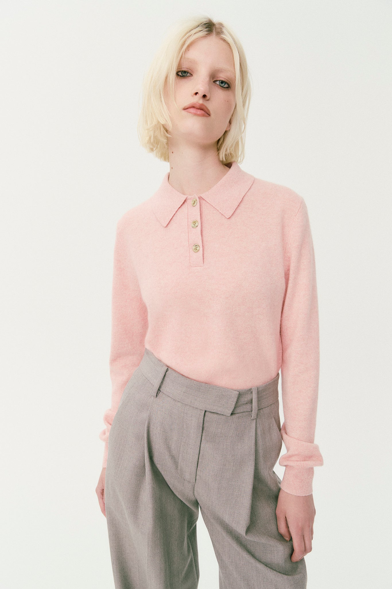 A midweight sweater made from 100% Cashmere for comfort and versatility. Features a classic collar and three-button placket, with rimmed buttons branded with an etched logo. Rib finishes at hem and cuffs.