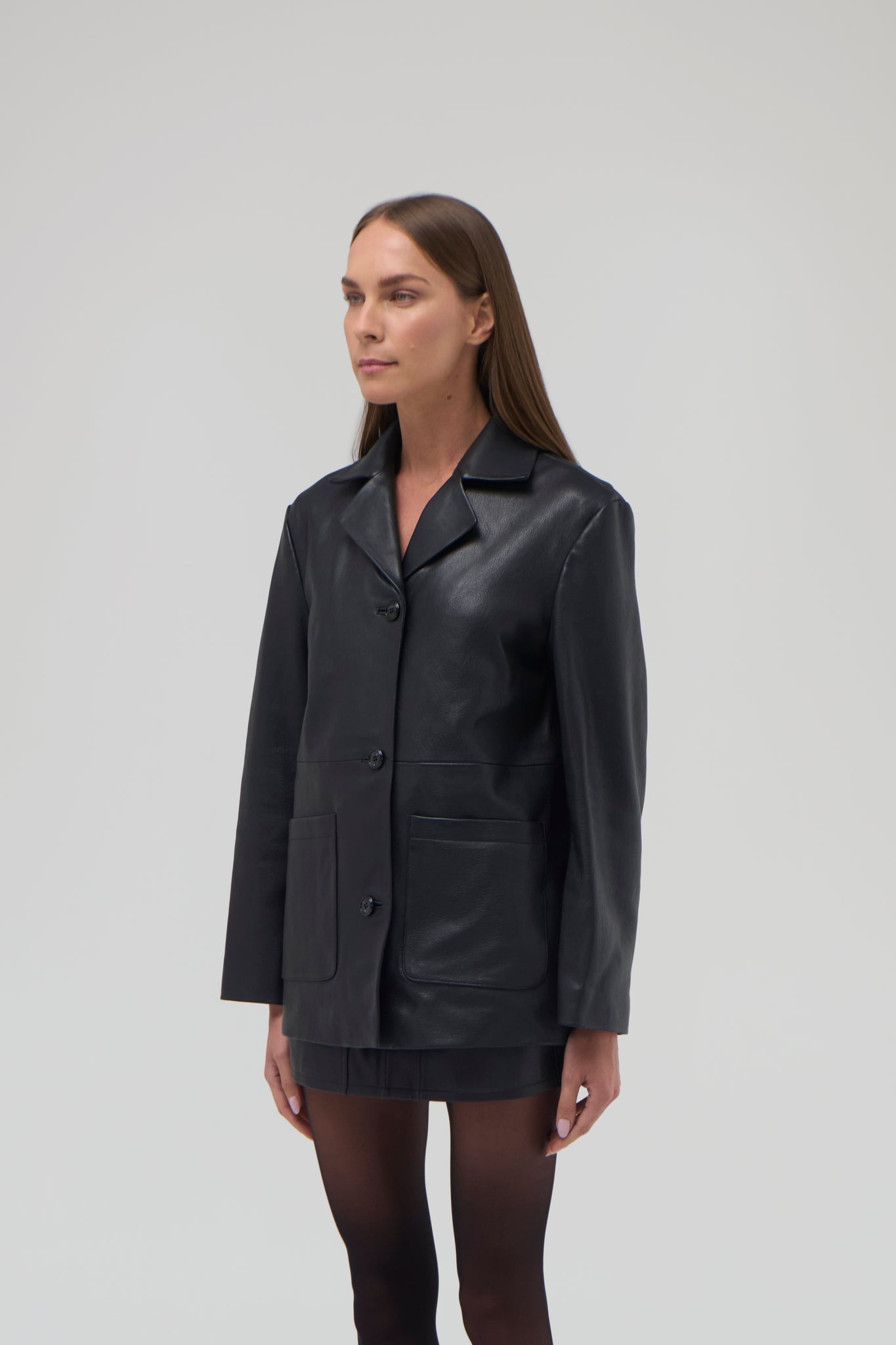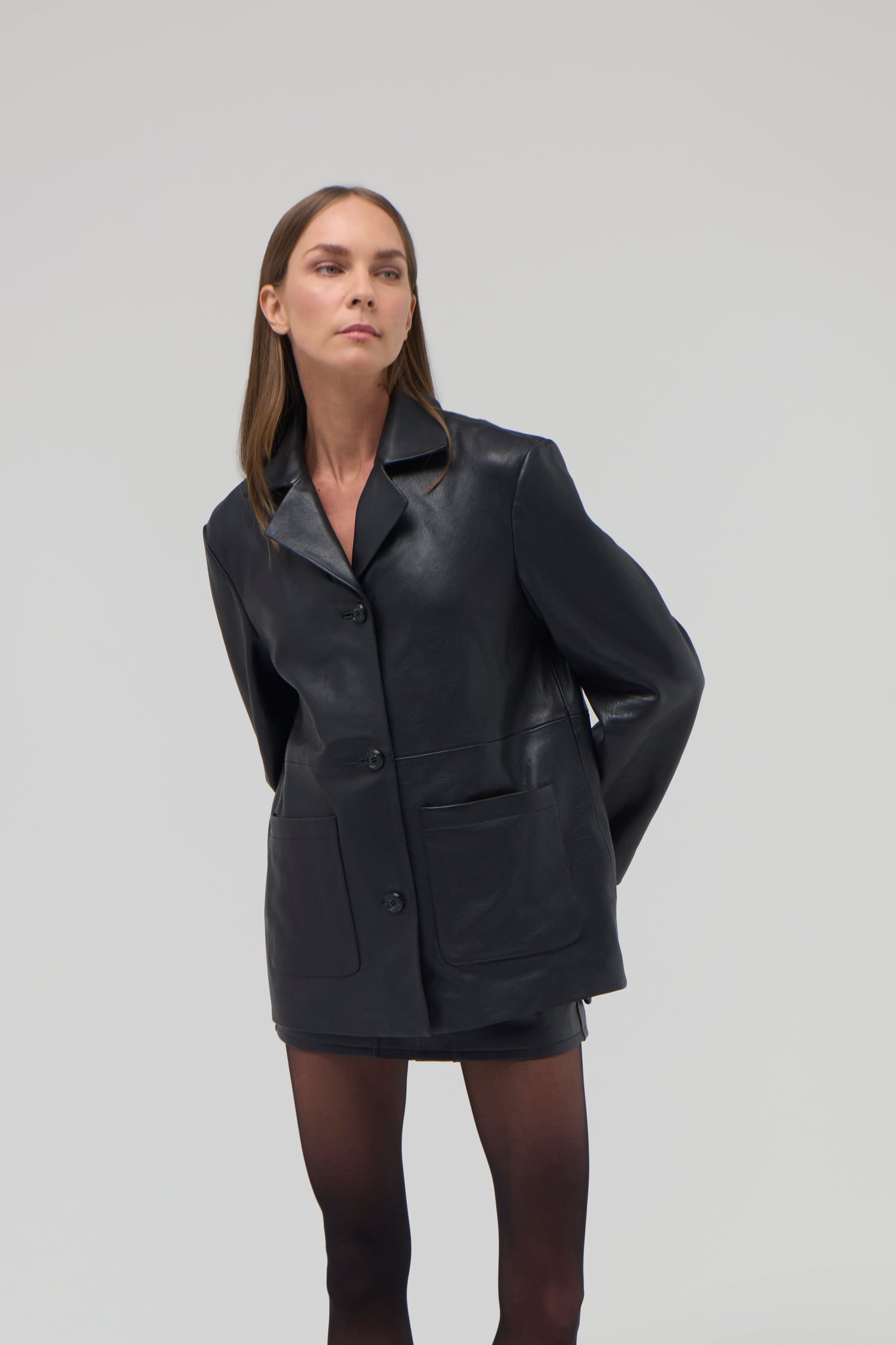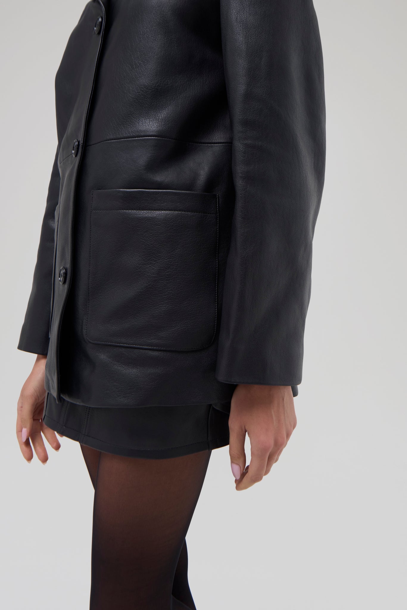 The Leather Blazer is cut from soft lamb leather with a classic, tailored shape. It features a notched collar, three-button closure, and clean front patch pockets. Fully lined for comfort and ease. Wear it layered over shirting or paired with the matching Leather Cargo Skirt.